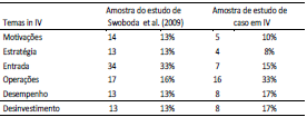 Na Tabela 3 são apresentadas, por tema de IV, a distribuição da amostra do estudo de Swoboda et al. (2009) – que inclui pesquisas quantitativas e qualitativas, com predomínio da primeira – e a distribuição da amostra desta pesquisa. No estudo de Swoboda et al. (2009), nota-se um equilíbrio entre temas de IV pesquisados, com destaque apenas para aqueles que envolveram modos de entrada na IV, com 33% da amostra. Já na amostra desta pesquisa, nota-se a prevalência de estudos de caso sobre atividades de IV que ocorrem no âmbito dos mercados de destino, representadas por estudos sobre o padrão de operação adotado nesses mercados, com 33% da amostra, e de estudos sobre desempenho e desinvestimento, com 17% da amostra para cada tema. A maior relevância das áreas temáticas identificadas na amostra deste estudo reflete os apelos de autores na área de IV em busca de aprofundamento no conhecimento sobre essas etapas do processo e na construção de novas teorias (Alexander e Doherty, 2010; Picot-Coupey et al., 2014; Swoboda et al., 2009).