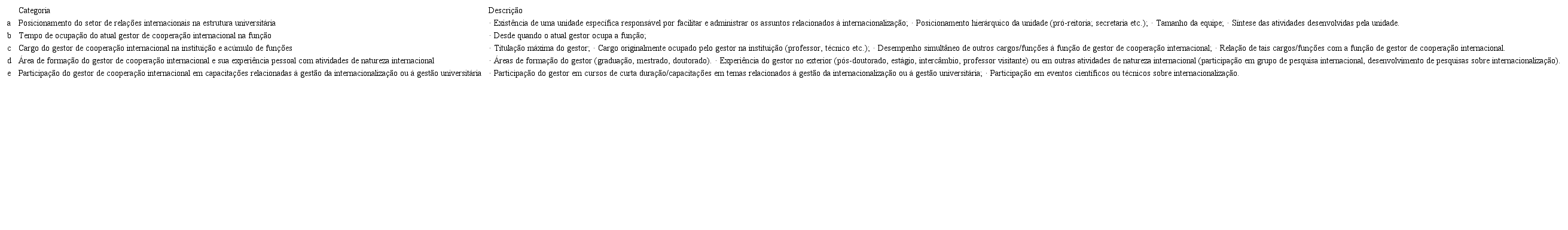 Para fins de análise, foram estabelecidas cinco categorias a partir do referencial teórico, mas também considerando as informações que estariam disponíveis nas bases selecionadas para a coleta e, ainda, a experiência prática das autoras na internacionalização da educação superior, uma vez que poucos estudos tratam da gestão da internacionalização no nível institucional e, principalmente, do perfil do gestor universitário de cooperação internacional. Se reconhece, dessa forma, que determinados vieses das autoras podem estar presentes nas categorias de análise desenvolvidas e nas análises dos resultados.
