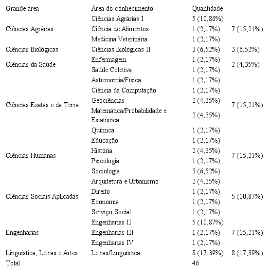 Relativamente à área de formação, foram consideradas as áreas do conhecimento descritas na categorização da Coordenação de Aperfeiçoamento de Pessoal de Nível Superior (Capes, 2014). Para viabilizar a análise, nos casos em que havia formação multidisciplinar, foi considerada a área da última titulação.