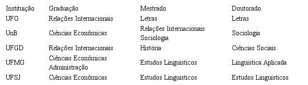 Destaca-se, também, que cinco gestores apresentaram formação multidisciplinar em áreas relativamente associadas a atividades de cooperação internacional (Relações Internacionais; Ciências Econômicas; História; Sociologia; Ciências Sociais; Administração; Letras; Estudos Linguísticos e Linguística Aplicada), todas pertencentes às grandes áreas de Ciências Humanas; Ciências Sociais Aplicadas ou Linguística, Letras e Artes.