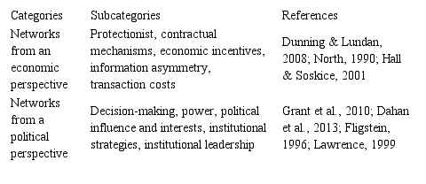 In this study, networks are analyzed as complex relationships between firms from a political perspective. In the political perspective, institutions carry the legacies of political, social, and historical forces, forming institutional arrangements according to their temporal path (Theilen & Steinmo, 1992). The political institutionalists analyze the political formal institutions, legal codes, administrative norms, rules, and laws (Scott, 1995). In the economic perspective, we can highlight the idea of property right, the efforts to reduce transaction costs, and the actions of regulatory agencies (Hall & Taylor, 1996). From a strategic view, networks are firms that can be used by managers or entrepreneurs to make their firms more competitive in the long run, aiming at a competitive advantage (Jarillo, 1988). Our purpose is to integrate networks, considering them as power sources that can interfere with political and economic decisions. In the following, we present economic and political perspectives of the networks, by using institutions as background.