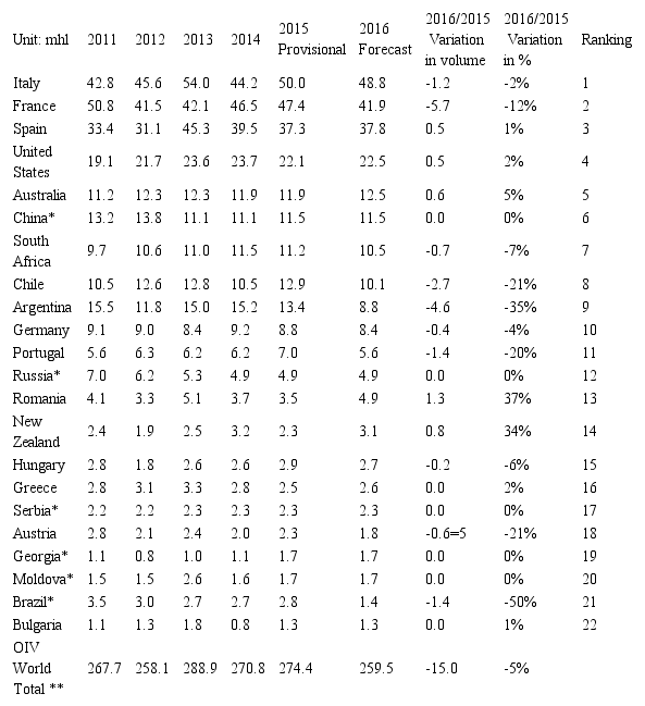 ** OIV estimate: mid-range estimate for evaluation of 2016 world production: from 255.0mhl to 264.0mhl.