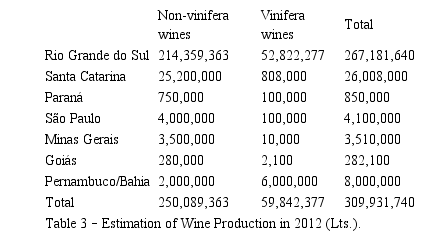 As in the grape cultivation, Rio Grande do Sul has more than 85% of the wine production in Brazil. However, only about 20% of those correspond to fine wines, with the others being table wines. Proportionally, Bahia and Pernambuco with the Rio São Francisco valley stand out. Even with an incipient production, 75% is directed to fine wines (Table 3). This region is one of the few regions in the entire world that allows for two harvests per year (Voltolini, 2013).