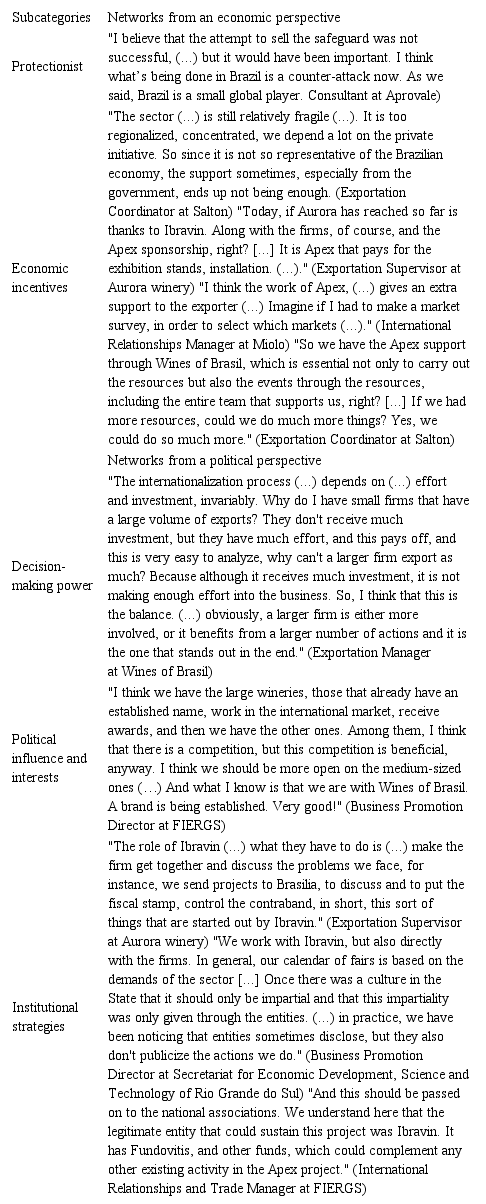 We considered networks as relevant for sharing resources and results between the firms, providing opportunities and sources of influence and power. From the economic and political perspectives, we considered the influence of institutions, as the government, on the networks and firms. For data analysis purposes, we used the content analysis technique in order to infer knowledge through the generation or not of quantitative indicators (Bardin, 2011). We analyzed the data by preparing summaries, interview recordings, in addition to the printed and digital materials. In order to systematize this entire material, we used NVivo software 10.0 to code and categorize the data. Then, we constantly compared the data (Strauss & Corbin, 1990) between theory and results, leading to a priori and a posteriori analysis of subcategories based on the reorganization of the evidence provided by NVivo. This process enabled to rename some subcategories and exclude others, causing the emergence of the institutional, political decisions as dominant for strengthening the networks. Finally, the results furthered the discussion of the institutional influences on the strategies of inter-firm networks, taking the Brazilian winery industry as a research field.