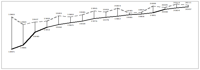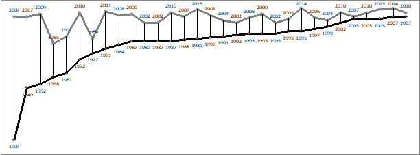 Figure1 shows that recently the process of internationalization of Brazilian companies of the sample has become faster. Taking into account all the companies the average period for internationalization is 21 years. When analyzing the internationalization excluding the three outliers companies it is 15.5 years on average.