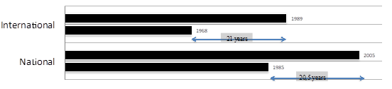 Figure 3 represents a summary of figure 2 and 3 showing that the average period for internationalization of international companies with year of foundation (1968) and year of internationalization (1989), and for Brazilian companies with year of foundation (1985) and year of internationalization (2005).