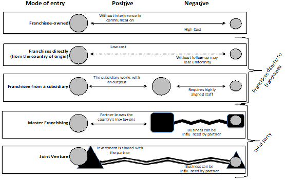 “How to expand”- Second phase is discussion on how to expand. The methods of entry and operation in international markets compiled from the traditional literature are: (i) Franchisee-owned; (ii) Direct Franchisee; (iii) Master Franchise; (iv) Joint Venture and (v) Franchisee from a subsidiary, with own office abroad (BURTON; CROSS, 1995; QUINN; ALEXANDER, 2002; ALIOUCHE; SCHLENTRICH, 2011). Control levels and investment in the internationalization of franchises are closely linked to methods of entry into foreign markets (JELL-OJOBOR; WINDSPERGER, 2013).