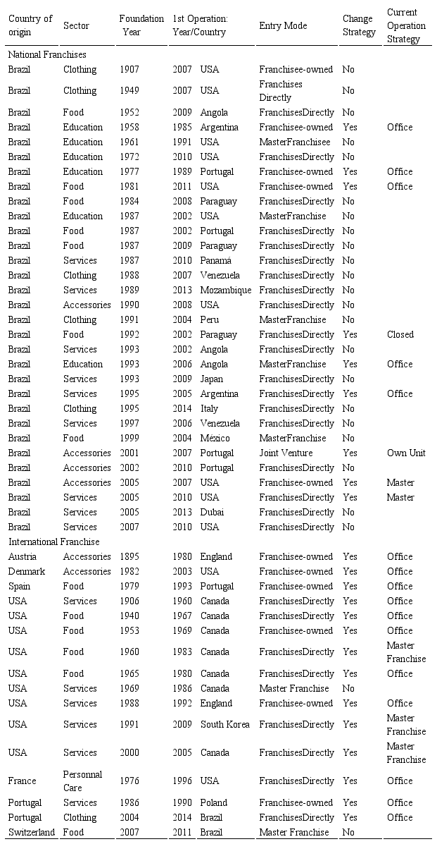 The research method adopted was a descriptive study based on the application of interviews and literature review. The concern in qualitative studies is to answer the question "What is happening here?" (GIBBS, 2009) and this is exactly the purpose of this study. The focus is to provide a description of the processes studied emphasizing the strategy of companies. After analyzing a list of Brazilian franchising companies and foreign companies operating in the country, 55 were contacted. For the study we initially chose Brazilian companies who own or have once owned units operating abroad. Of the 42 companies interviewed, 11 questionnaires were discarded due to the lack of relevant information. After verification and validation of all data, the responses of 31 domestic companies that satisfied all chosen criteria were considered. Twenty-one foreign companies operating in the country responded to the questionnaire. For the purposes of this study the companies whose origin was in developed countries were chosen. As a result, five questionnaires were discarded resulting in a sample of 16 companies for the study.