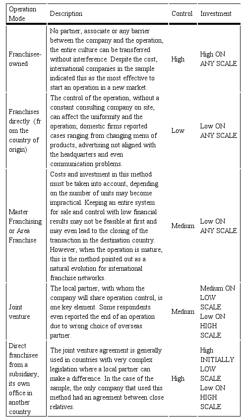 Master Franchise and Joint Venture - In the franchise called “Third party“, the dependence on local partner is large. When this partner understands the business and the organizational culture combines these aspects with good relationships and good information flow, this method can be an attractive option for development in foreign markets. Usually the master franchisee absorbs part of the costs, which makes operational investment lower. If a joint-venture agreement occurs, the initial cost can be shared between the partners. Thus, it does not become a high investment. Both third-party agreements (Master Franchise and Joint Venture) bring a distinctive element frequently out of scope of the existing literature. According to respondents, these operating modes experience influence on the Third Party, so the franchise in actuality is not always exactly the one envisaged by the country of origin. This study does not intend to characterize all these nuances.