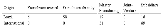 This undertaking, even after being subsidized initially by the Brazilian government, was only made possible by a large investment in the brand. According to one of the managers "Due to the fact that the company had already considerable structure in the domestic market and financial health, it could choose this strategy for its first internationalization." Table 4 summarizes the current operating mode of Brazilian and international franchises by percentage.