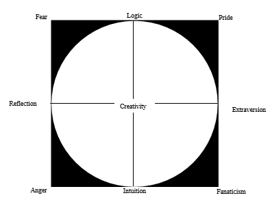 In the model presented by Pinheiro (2009), two axes intersect. The horizontal axis runs from reflection to extraversion, while the vertical axis runs from logic to intuition. The white area represents the conceptual space discussed in his study, while the black area represents resistance to change, expressed by anger, fanaticism, pride, and fear. From Pinheiro’s perspective, it is more likely that creativity will emerge as a resource in environments in which logic and intuition are in equilibrium, and the same is true for reflection and extroversion.