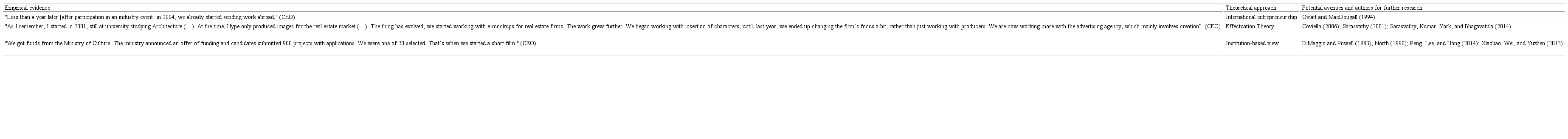 We named the first block antecedents. We identified possible contributions to the internationalization approach from the viewpoint of entrepreneurship (Oviatt & MacDougall, 1994), which also connects to the emerging theory of effectuation (Sarasvathy, 2001). The firm’s rapid internationalization in the early years has relevance for the international entrepreneurship approach. The effectuation approach has also been proposed and applied in international business studies over the last decade (Coviello, 2006; Sarasvathy et al., 2014; Schweizer, Vahlne, & Johanson, 2010). In parallel, institutional aspects of this scenario could also be investigated, which not only connects to the Institutional Theory (DiMaggio; Powell, 1983; North, 1990) but also to the institution-based view (Peng et al., 2014; Xiaobao et al., 2013). A priori, these data could indicate the theoretical foundations for further study of how firms in the creative economy evolve and connect with the global business.