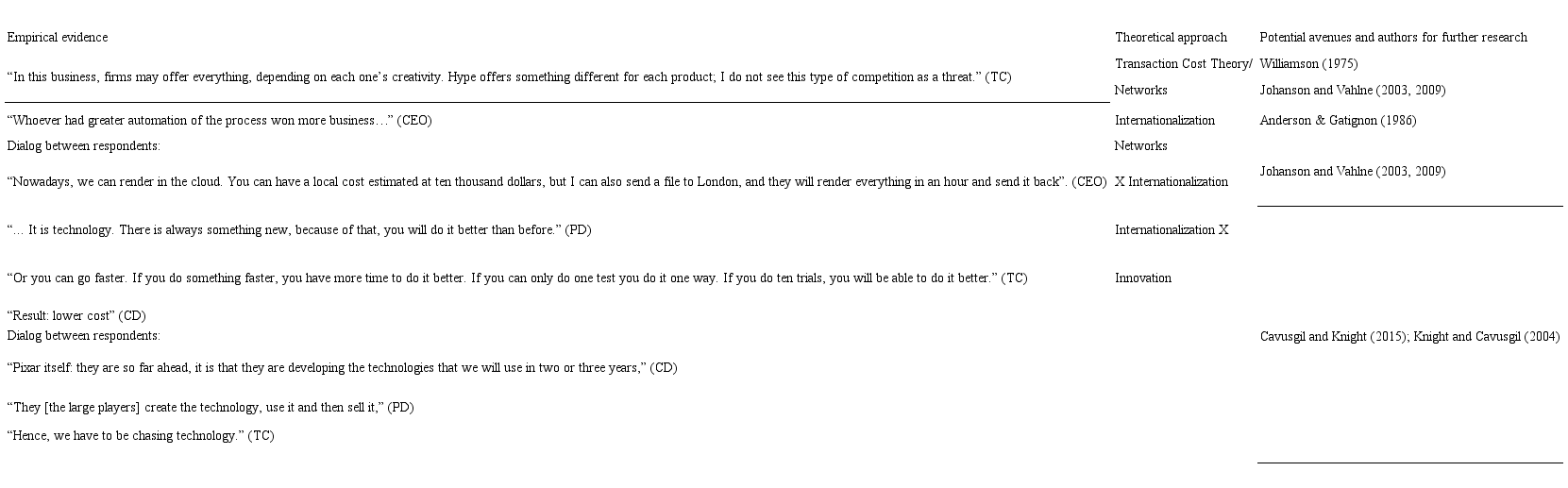 Table 1 lists some lines of research and theoretical approaches of relevance to evidence that emerged from the participants’ discussion of the antecedents flashcards bearing the words: experience, beginning, and past. We do not intend to explore in depth the theoretical approaches that we have identified, the intention is rather to indicate some seminal work that could contribute to future research about internationalization of CEFs.