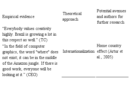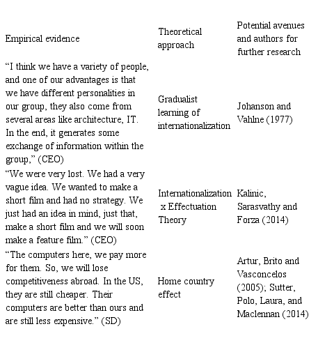 Our aim in this study was to identify ways in which the international business literature could be helpful for understanding how internationalization takes place in firms in which creativity is a valuable resource. Besides understanding how the internationalization process occurs, we wanted to select theoretical approaches that might be more compatible with advances in the creative economy and its international integration. Our findings contribute in two ways: by investigating a different object of study and by adopting an unusual method to examine internationalization.