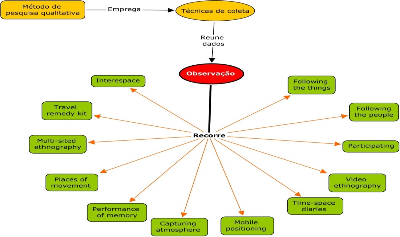 Em se tratando de pesquisas sobre as novas mobilidades, a observação recorre a estratégias específicas de coleta para cada aspecto das mobilidades, revelando-se uma extensão da observação, conforme o conteúdo da Figura 1.