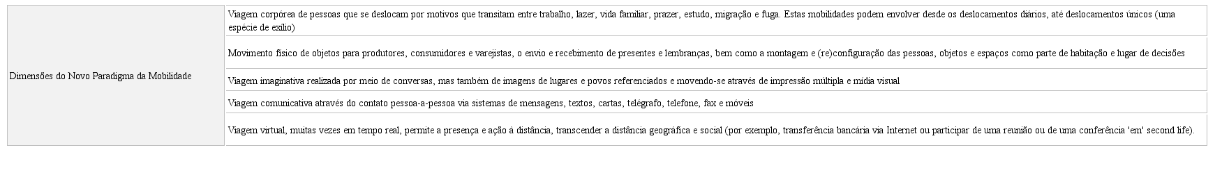 Na contemporaneidade, da gripe aviária aos acidentes de trem; da expansão de aeroportos ao congestionamento aéreo e ao aquecimento global; das manifestações políticas ao terrorismo global em rede; sem esquecer a gestão de situações de emergência decorrentes de tsunamis, terremotos, furacões ou erupções vulcânicas, a mobilidade situa-se no centro destes eventos. Assim sendo, tanto as organizações públicas, quanto as privadas e sem fins lucrativos estão progressivamente procurando compreender, monitorar, gerenciar e transformar aspectos destas múltiplas mobilidades, e das novas imobilidades, exclusões sociais e ameaças de segurança que podem de uma forma ou de outra, estar associada a elas (Hannan, et al, 2006). Além de entender os meandros intrinsecos às mobilidades, faz-se igualmente necessário investigar as imobilidades refletidas em lugares onde o movimento está temporariamente estagnado ou atenuado, fronteiras, aeroportos, rodovias, hotéis, motéis, hospitais, centros de detenção, campos de refugiados etc. (Sheller, 2011). Ressalta-se que a pesquisa no contexto deste paradigma, em seu sentido mais amplo, leva em conta não apenas o movimento físico, mas também o movimento potencial, o movimento bloqueado e a imobilização (Urry, 2007). Segundo Cresswel (2010), compreender estas questões em conjunto acrescenta mais do que a soma das partes. Para ele, a pesquisa das mobilidades conjectura sobre uma variedade de elementos que se movem, incluindo os seres humanos, ideias e objetos. O autor se interessa particularmente em compreender como essas coisas se movem por caminhos que se interligam e como são capazes de permitir ou impedir que outras se movam. No contexto das novas mobilidades, Urry (2007) reconhece a existência de cinco dimensões, sem desconsiderar suas inevitáveis inter-relações (Quadro 1): viagem corpórea, movimento físico dos objetos, viagem imaginativa, viagem comunicativas e viagem virtual.