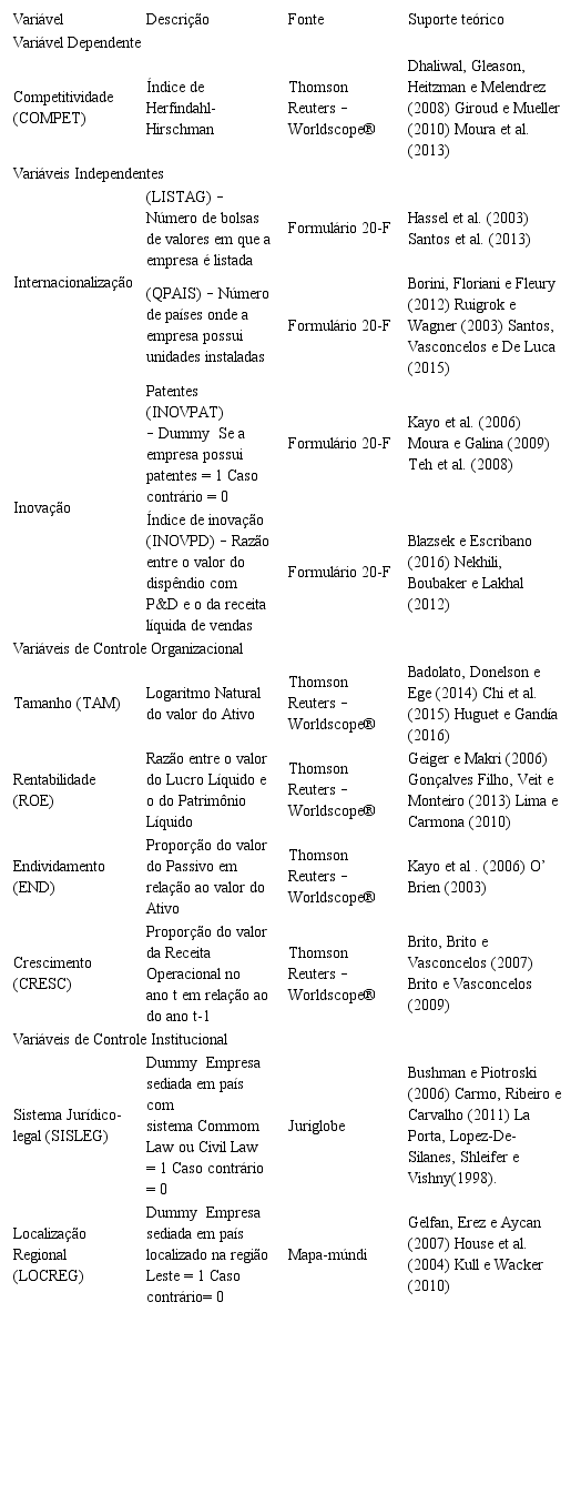 Na Tabela 1, observam-se a descrição, as fontes e o suporte teórico das variáveis utilizadas na pesquisa.