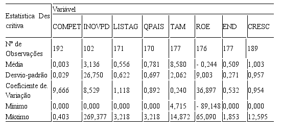 A análise dos resultados tem início com a apresentação da estatística descritiva das variáveis do estudo (Tabela 2), que reflete as características das empresas da amostra.