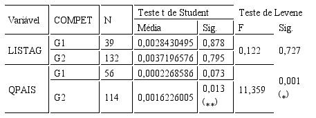 Com base nos dados da Tabela 3, pode-se afirmar que, pelo teste de Levene, o número de bolsas de valores em que a empresa é listada (LISTAG) apresenta variabilidade semelhante em termos de competitividade tanto para as empresas mais internacionalizadas como para as menos internacionalizadas. Além disso, destaca-se que a internacionalização mostra-se, em geral, igual em ambos os grupos ao considerar seus níveis de competitividade, já que o teste t de Student não apresentou significância estatística.