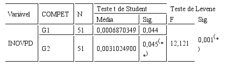 Os resultados sugerem uma alta heterogeneidade entre os níveis de competitividade evidenciados por G1 e G2 (teste de Levene, sig. <0,05), denotando que as empresas mais inovadoras apresentam menor competitividade (0,06%) em relação às empresas menos inovadoras, que tendem a apresentar maior competitividade (0,3%), contrariando Botelho e Guissoni (2016), segundo os quais as empresas inovadoras tendem a apresentar maior competitividade.