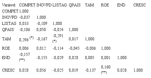 Saliente-se, contudo, que a variável tamanho se correlaciona positivamente com o nível de competitividade, sugerindo que, na medida em que a empresa se expande, sua competitividade cresce na mesma proporção, confirmando os apontamentos de Cho e Pucik (2005) e Terra, Barbosa e Bouzada (2015). Por outro lado, o tamanho se correlaciona negativamente com o número de bolsas de valores em que a empresa é listada.
