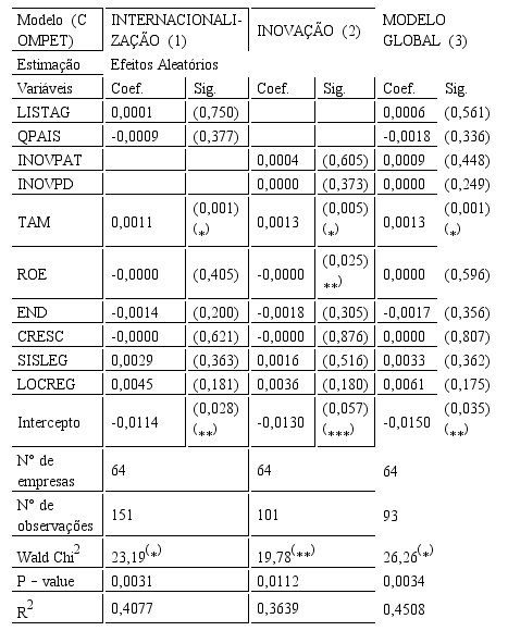 Para se alcançar o objetivo geral e testar as hipóteses, realizou-se a análise de regressão linear múltipla com dados em painel. A Tabela 6 mostra os resultados da análise para verificar a influência da internacionalização (LISTAG e QPAIS) e da inovação (INOVPT e INOVPAT) na competitividade das organizações.