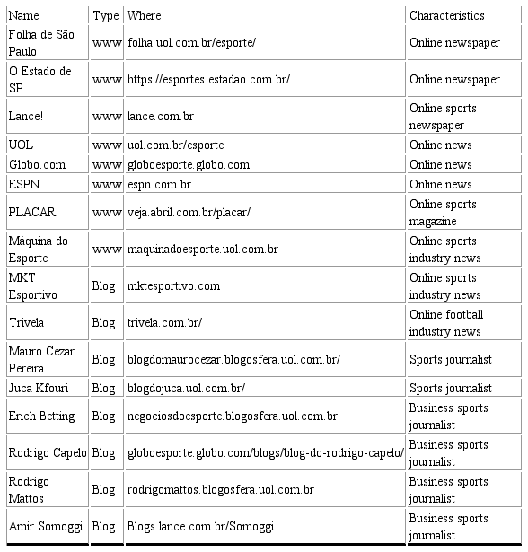 First, from March 2016 to July 2019, we separated information obtained from main national media sources concerning the subject. We started following the sports sections of major Brazilian newspapers and news sites, which served as the initial main sources. In addition to these portals, as we became more familiar with the specific theme, we observed that some sports journalists mainly focus on the sports culture and market, and thus, we followed their blogs (Table 1).