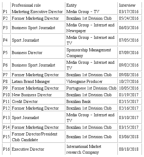The interviews began with a grand tour question (McCracken, 1988), and each interviewee was asked about his/her professional start in the football market, followed by his/her opinion regarding the current market stage in Brazil in a poststructuralist interview focusing on structures and practices (Fischer, Castilhos and Fonseca, 2014). Relevant questions queried each professional's opinion regarding the structure of the national market, perceived maturity of the industry, how he/she understands the presence of European clubs in the national market, consumer behavior, concerns related to content generated by various media and the management of Brazilian and European clubs.