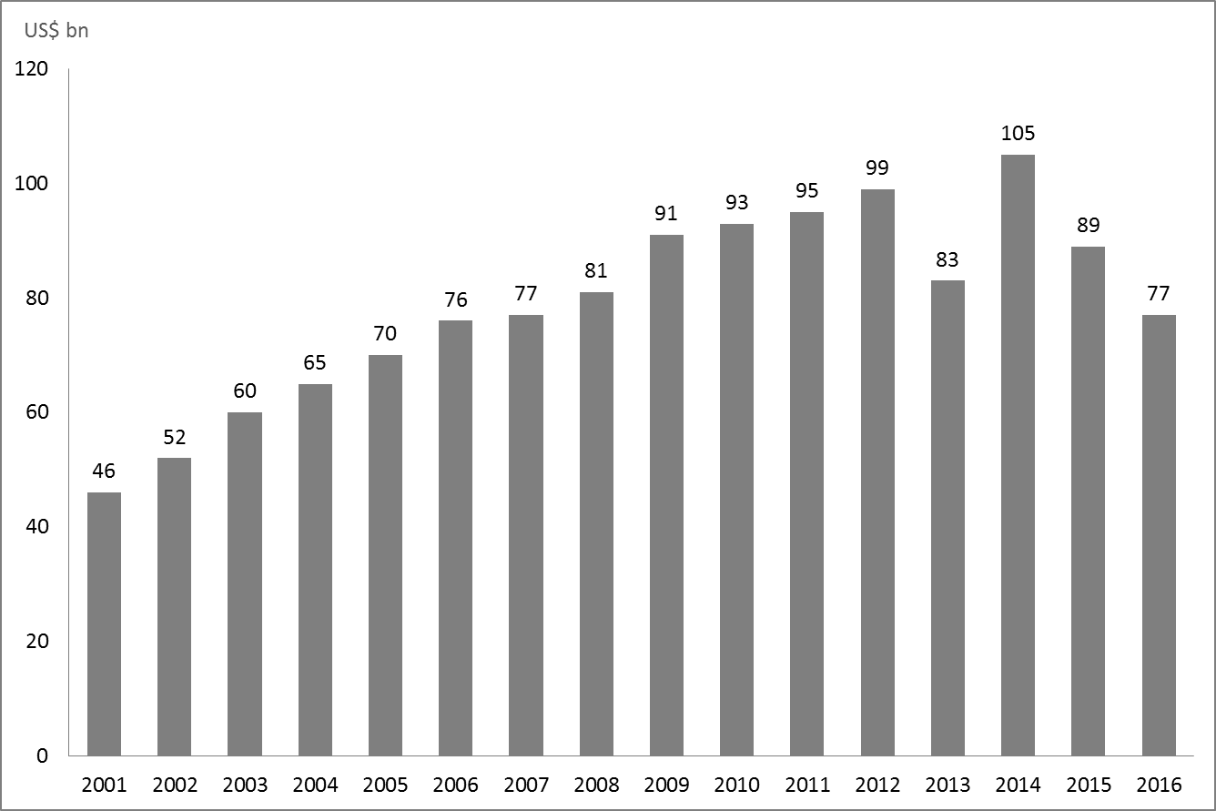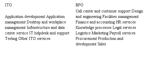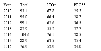 The IT outsourcing market is usually divided in two segments: information technology outsourcing (ITO) and business process outsourcing (BPO). ITO involves contracting service providers to develop or manage IT functions outside the organization, while BPO consists in contracting third parties to perform back-office or internal functions (such as accounting), and front-office or customer service activities (such as call center). Table 2 lists some of the ITO and BPO services used by European companies. According to Statistica (2017), the global outsourcing industry had a total revenue in 2016 of approximately 77 billion dollars, of which almost 69% came from ITO (Table 3). Industry revenues have seen a major drop in 2013 (Figure 2).