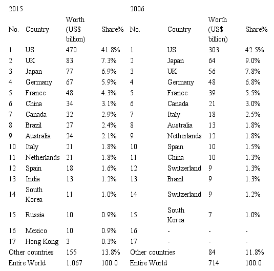 In 2015 the global IT market was estimated at 2.2 trillion dollars, led by the U.S. (727 billion), China (227 billion) and Japan (139 billion). Referring specifically to the world market for software and IT services, the U.S. had a share of more than 40% (Table 1).