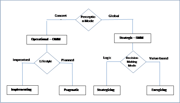 The first step was to verify the Perception Mode Index: concrete (Operational) or global (Strategic). If concrete, the relevant index to be used in the next step will be the lifestyle index – planned or improvised –, which will result in the implementing and pragmatic mental models, respectively. If global, the next step will be to verify the decision-making mode – logical or based on values – which will result in the strategizing and energizing mental models.