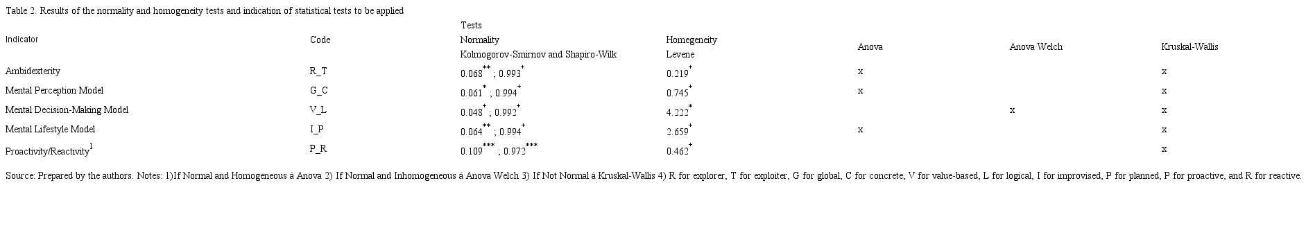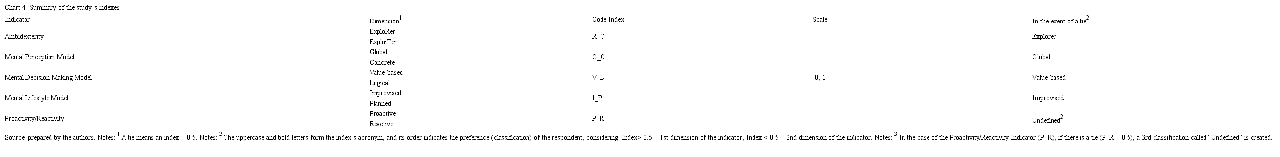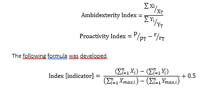 A formula was developed to analyze the answers and compare the 5 indexes created (ambidexterity; mental models (3); and proactivity/reactivity), adapted from the original authors to standardize and resize the values of the instruments, due to differences between the scales of the mental models and ambidexterity.