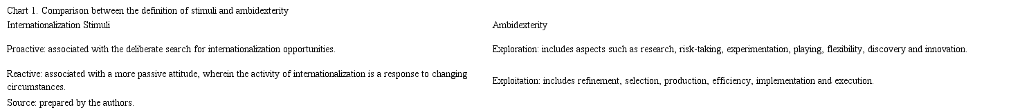Thus, the preference for one of them may underlie the reactions to internationalization stimuli. The comparison between the definition of proactive and reactive stimuli and of exploration and exploitation (Chart 1) sheds light on the relationship between the higher probability that the adoption of the exploration strategy would lead to a more significant reaction to the proactive stimuli, and that the adoption of the exploitation strategy would lead to a preference for responding to reactive stimuli.