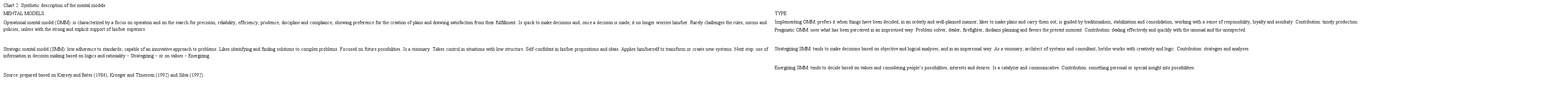 This shows there are differences in the ways in which subjects perceive the environment and make decisions. Based on these studies, Bressan (2018) proposed two mental models: The Strategic Mental Model (SMM) and the Operational Mental Model (OMM) (Chart 2).