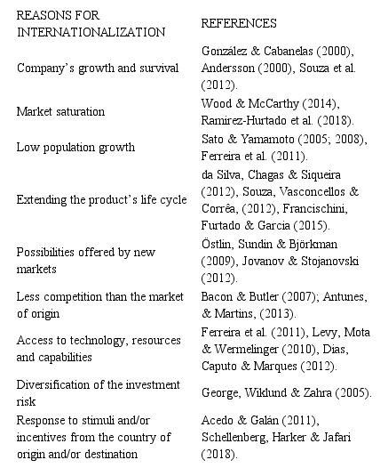 There are several reasons leading companies adopt internationalization practices (Andersson, 2000) (Chart 3). In general, as they gain international experience and knowledge (Eriksson, Johanson & Majkgård, 2015), companies expand their business to more distant markets, in a gradual and evolutionary process (Oliveira; Figueira & Pinhanez, 2018), preferring to work in markets that are similar to those of their country of origin (Khojastehpour & Johns, 2014; Loué, 2018).
