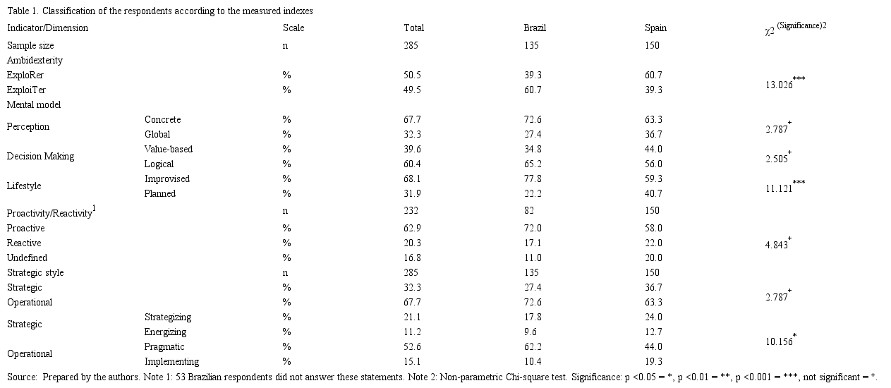 Regarding ambidexterity, the data indicate (p<0.001) that Spaniards tend to have greater preference for exploration (60.7%) than Brazilians (39.3%) (Table 1). As for the proactivity index, the results indicate greater willingness for proactivity among Brazilians (72.6%) compared to Spaniards (58.0%), and lower incidence of the “undefined” category among Brazilians (11.08%) compared to Spaniards (20.0%) (significance = p<0.05).