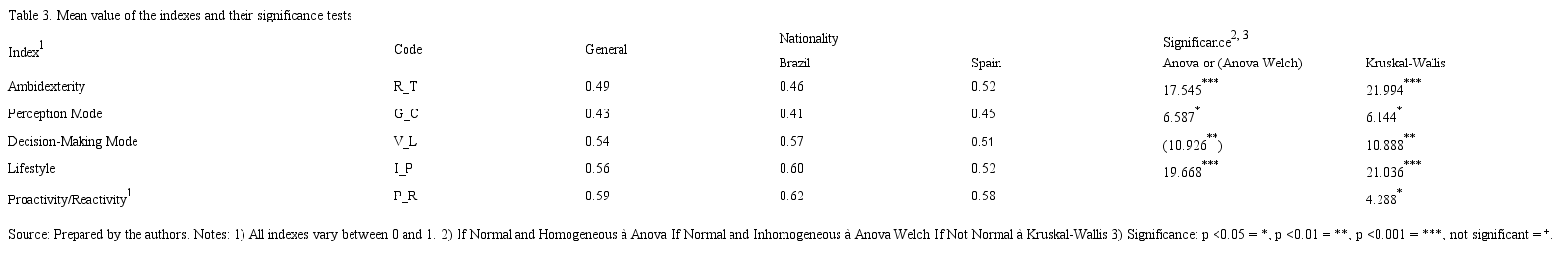 Table 3 presents the mean values of the indexes and their significance tests (Anova Welch and Kruskal-Wallis). The results indicate that Spaniards have a more pronounced attitude towards exploration (0.52) than Brazilians (0.46) (significance p<0.001). The results for decision-making mode show that Spaniards have greater preference for the logical mode (0.45) than Brazilians (0.41) (significance p<0.05). Regarding lifestyle, Brazilians show greater preference for improvisation (0.60) compared to Spaniards (0.52) (significance p<0.001). As for the willingness to respond to stimuli, Brazilians tend to be more proactive (0.62) than Spaniards (0.58) (significance p<0.001/Kruskal-Wallis). These differences make it possible to state that, for this sample, the country of origin has a significant influence on these factors.