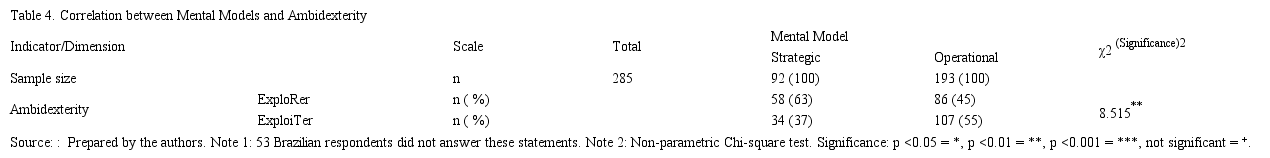 The Anova statistical technique was employed to perform an analysis using the mean value calculated for each index. This is justified since the mean values obtained on a Likert scale are accepted as being on a ratio scale and, therefore, preserve much more information than when on a nominal scale. However, considering the case of two respondents, one with a mean value of 0.51 for ambidexterity and the other with a mean value of 0.49: the former would be classified as an “explorer”, and the second as an “exploiter”, but with minimal difference between scores (0.51 - 0.49 = 0.02), practically irrelevant from a practical point of view.