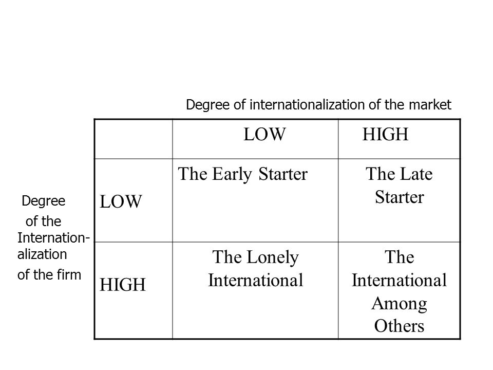International among Others is characterized by the high degree of internationalization of the firm and the market. In this case the firm, already embedded in the business network, has greater access to external resources.