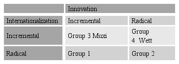 While neither of the two firms has undergone a typical radical internationalization (75% of total sales from foreign markets and serving more than 20 countries), Wett is closer to that than Muxi, since it internationalized just a year after inception, is present in more countries (ten versus only five) and has a much more significant proportion of its sales from the foreign market (40-60 percent, versus 6 percent). However, neither can Wett’s internationalization process be considered incremental, as defined by Chetty and Stangl; thus, it occupies an intermediate position between groups 2 and 4 in Figure 3 below.