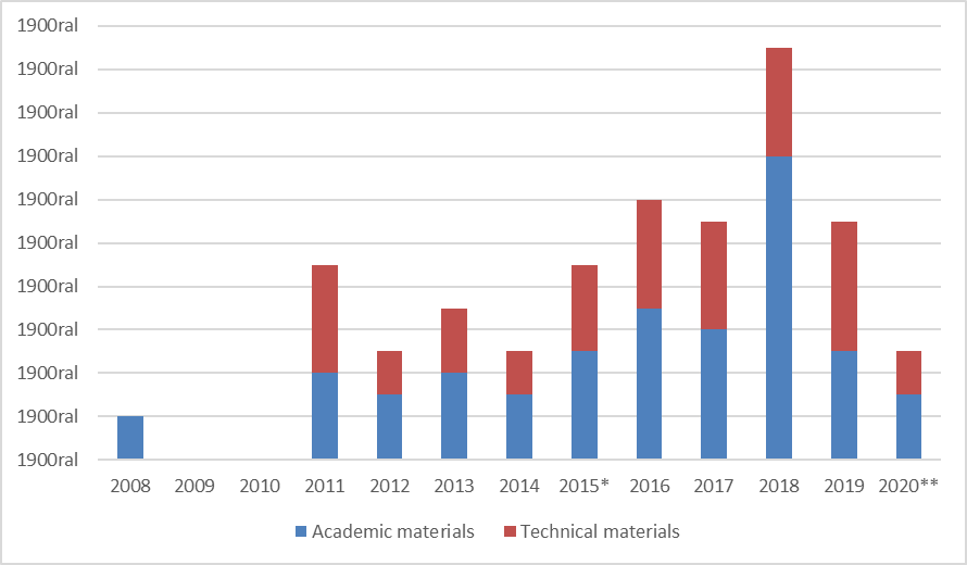 There is a predominance of academic papers produced as a requirement for obtaining degrees in higher education institutions, which account for 32.6% of the selected materials, followed by opinion articles and scientific papers. However, such percentages may not reflect the relative global share of these publications due to possible biases in determining the consulted sources. Recent and growing interest in the subject is evident, first mentioned in the selected materials in 2008 but which received increased attention in the last years, as shown in Figure 1.