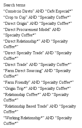This study comprises published materials - in English and Portuguese - until May 2020, selected using the search terms shown in Table 1, both for academic and technical materials. Although the term "Direct Trade" emerged in 2006, we decided not to use a time filter. This is because, in practice, Direct Trade has been observed since the early 1990s, and has been called in different ways ever since.