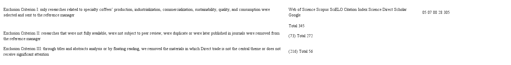 The sources for technical materials included the Specialty Coffee Association (SCA) website and the Perfect Daily Grind website - specialized in the publication of news and technical information about specialty coffees by professionals around the world -, selected by their reputation and authority in the specialty coffee market. In addition, we also used the mentioned index databases for the selection of books and chapters related to the topic. As emphasized by Kallio, Pietilä, Johnson and Kangasniemi (2016, p. 6), "in the case of sparse or fragmented knowledge in the literature", which is the case of the topic in question, "empirical knowledge could be used to complement and deepen the theoretical background", helping to understand the phenomenon under study. Therefore, this study sought to achieve an in-depth theoretical-empirical understanding of direct trade.