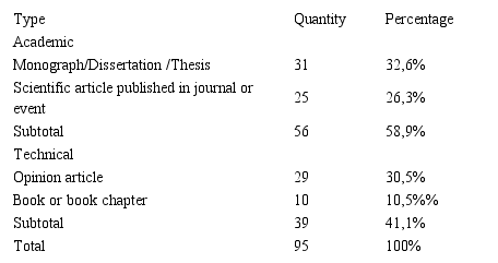 Our searches resulted in the selection of 95 materials for analysis: 56 academic and 39 technical works. Table 3 presents their characterization and contribution to the sample.