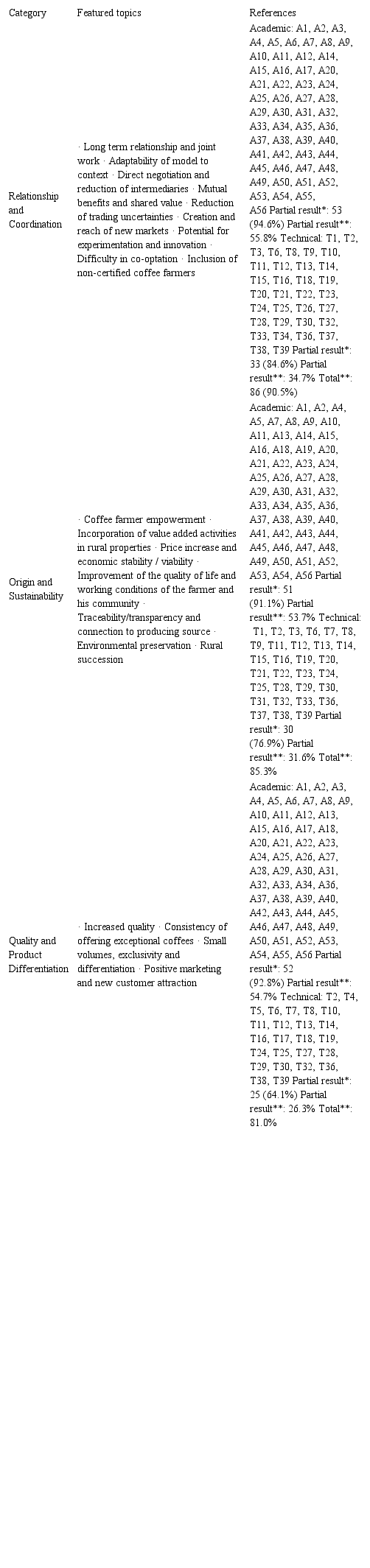 The potential and contributions of direct trade were organized into three categories - “Relationship and Coordination”, “Origin and Sustainability” and “Quality and Product Differentiation” (Table 4) - established according to the proximity of its subthemes as suggested by Campos (2004) and Caregnato and Mutti (2006).