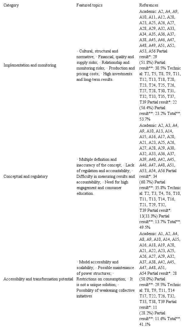 The 95 selected materials were coded according to their category (Appendix A and B) and were subject to the content analysis technique for its content coding and analysis. A qualitative and semantic (Bastos, de Oliveira, Souza, Santos, & do Lago, 2019) approach was used, not centered on the frequency of citations of a term in the text but rather on its presence or not in the selected material.