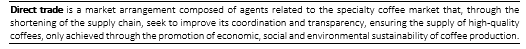 Such initiatives include the implementation of the International Coffee Agreements (ICAs), the advent of certifications and the practice of direct trade, which is the focus of this work. However, while the ICAs and certifications are already widely documented in the technical and scientific literature (Akiyama & Varangis, 1990; Auld, 2010; Bacon, Méndez, Gómez, Stuart & Flores, 2008; Barham & Weber, 2012; Clarke, Barnett, Cloke & Malpass, 2007; Gilbert, 1996; among many others), direct trade remains little explored (Borrella et al., 2015). Its debate usually takes place in events, specialized news portals, blogs and online social networks, lacking new theoretical-empirical studies that contribute to its better understanding and greater effectiveness. In addition, the absence both of a third-party certification and a consensual concept, which is commonly misused (Edelmann, Quiñones-Ruiz, & Penker, 2020; Hernandez-Aguilera et al., 2018; Vicol et al., 2018) hinders this practice’s study and its transformative potential.