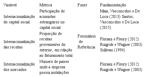 As variáveis independentes, constituintes da internacionalização, contidas no modelo, suas métricas, a fonte de coleta dos dados e a base teórica para cada uma delas estão explícitas na Tabela 1.