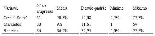 No que tange à internacionalização das receitas, são 36 as empresas que exportam, com uma média de aproximadamente 37%. Esse resultado diverge da pesquisa de Floriani e Fleury (2012), os quais afirmam que a exportação é a forma mais comum de internacionalização. Os dados apresentaram elevada dispersão, com alta variabilidade entre as empresas da amostra, destacando-se a Vale com as receitas provenientes de subsidiárias estrangeiras correspondendo a 92% do faturamento total.