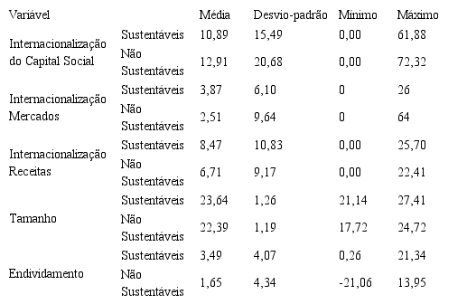 A Tabela 3 apresenta a estatística descritiva das variáveis de internacionalização agrupadas pela variável dummy, que classifica as empresas da amostra como sustentáveis e não sustentáveis.